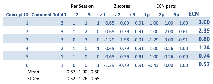 A feature of the ECN score, as defined above, is that this number can never be greater than the total number of recorded comments or less than zero. Thus, if the total number of comments relating to a concept is 12, the ECN score can only be equal to or lower than 12, but not greater. Therefore, if the comments are not evenly distributed across the sessions, the ECN score will be lower than the total number of comments represented based upon the fact that this concept is not ubiquitous. For example, concept A, with an ECN of 12, is twice as important and more widely held than concept B, with an ECN of 6.