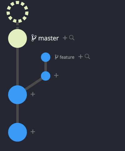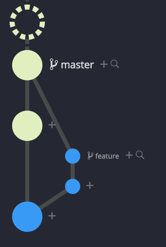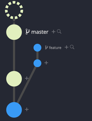 The resulting git graph clearly shows that the feature branch is a parent of the master or top commit. All commits are in their original places. The merge can be undone by reversing just one comment.