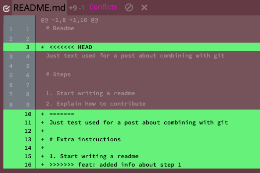 Merging means that all conflicts are resolved at once in one commit. In our example repo, the conflicts would look like the following: